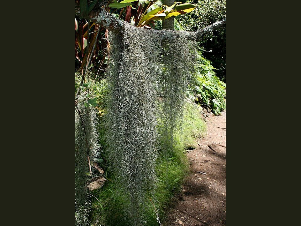 Spanish moss is a type of bromeliad that hangs from tree branches in long, flowing strands. It is an epiphyte, meaning it lives on trees, but it does not extract nutrients directly from the tree itself. Instead, it collects moisture from the air and relies on rainwater and humidity to sustain itself. Spanish moss is found in the southeastern United States, often hanging from oak and pine trees, adding a unique, ethereal look to the landscape.