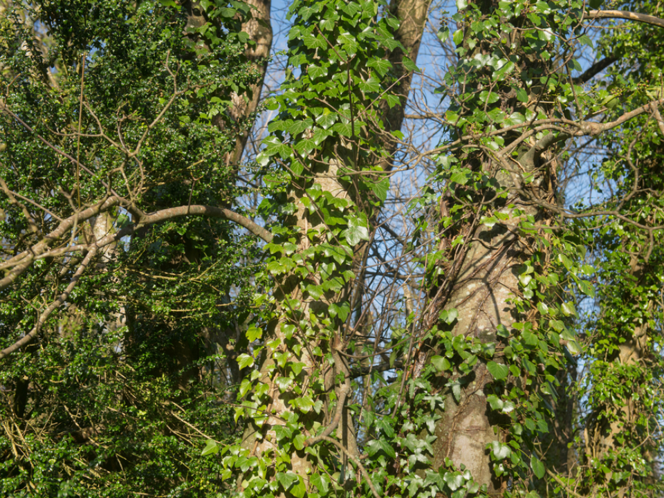 Ivy can grow in dense patches, covering tree trunks and branches, yet it does not harm the tree unless it becomes excessively heavy. The tree provides support for the ivy, allowing it to access sunlight higher in the canopy. In return, ivy offers shelter for small animals, including birds and insects. This relationship between ivy and its host trees is one of coexistence, rather than parasitism.