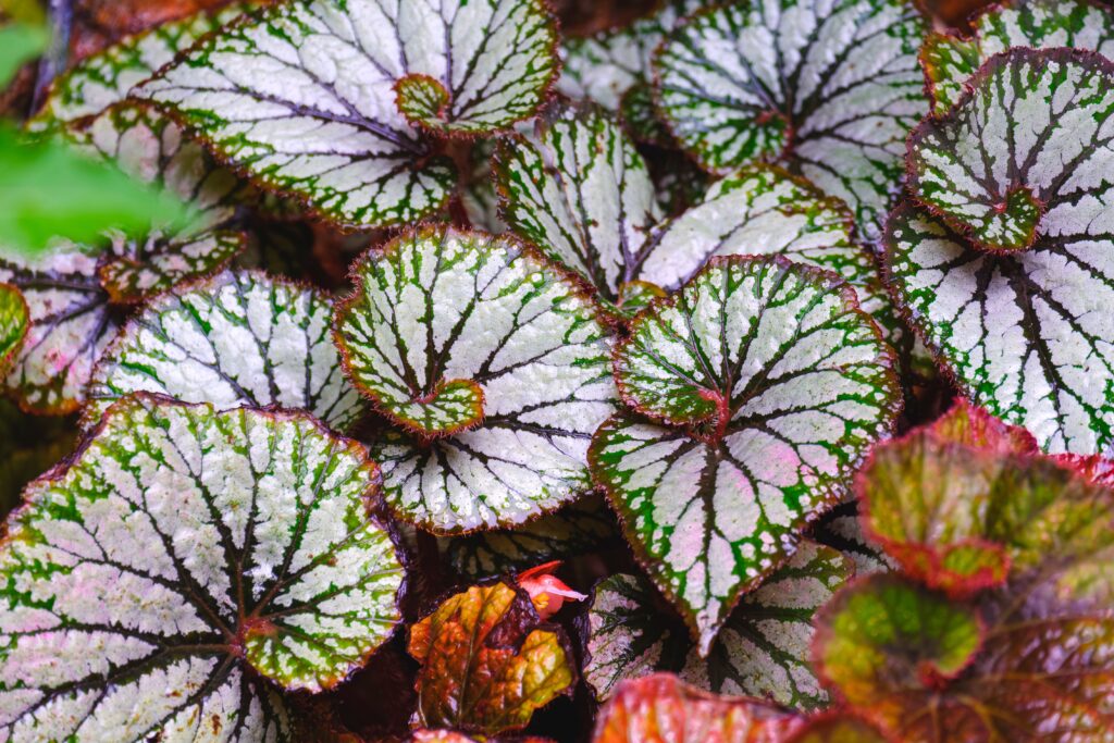 Begonia Rex is frequently grown for its spectacular leaf patterns that feature swirls, stripes, and splashes of color in shades of silver, red, green, and purple. Each cultivar can look very different, and collectors often seek out rare varieties for their distinctive foliage. These begonias come from tropical regions, and they respond best to bright, indirect light to help maintain the sharp contrast in their patterns.