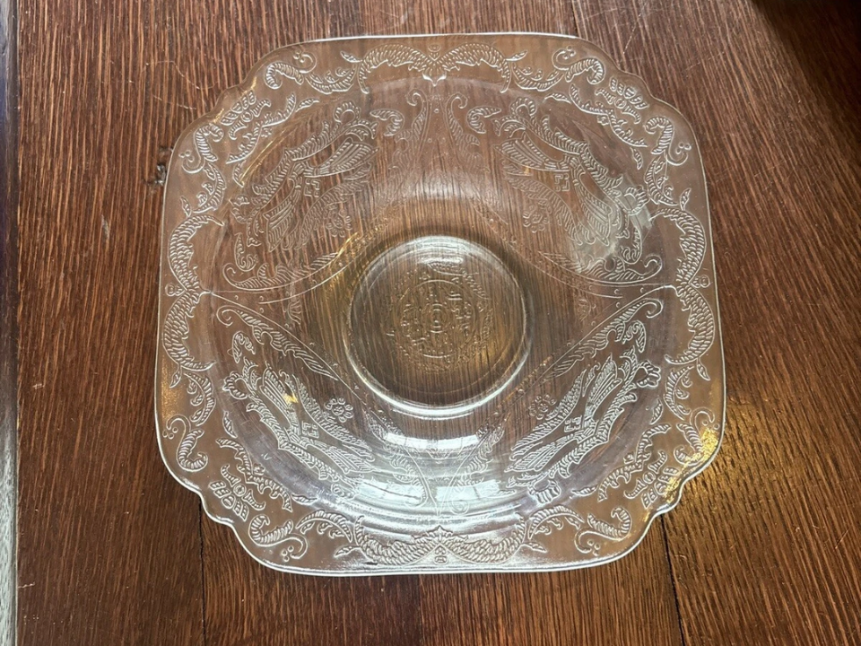 The Windsor Pattern by Jeannette Glass is highly sought after by collectors due to its unique and detailed design. Featuring large, bold floral shapes and soft, flowing curves, the Windsor Pattern was produced in the 1930s and became a hallmark of Depression-era glassware. It is often seen in pink, green, and clear glass and includes a range of pieces such as bowls, plates, and pitchers.
