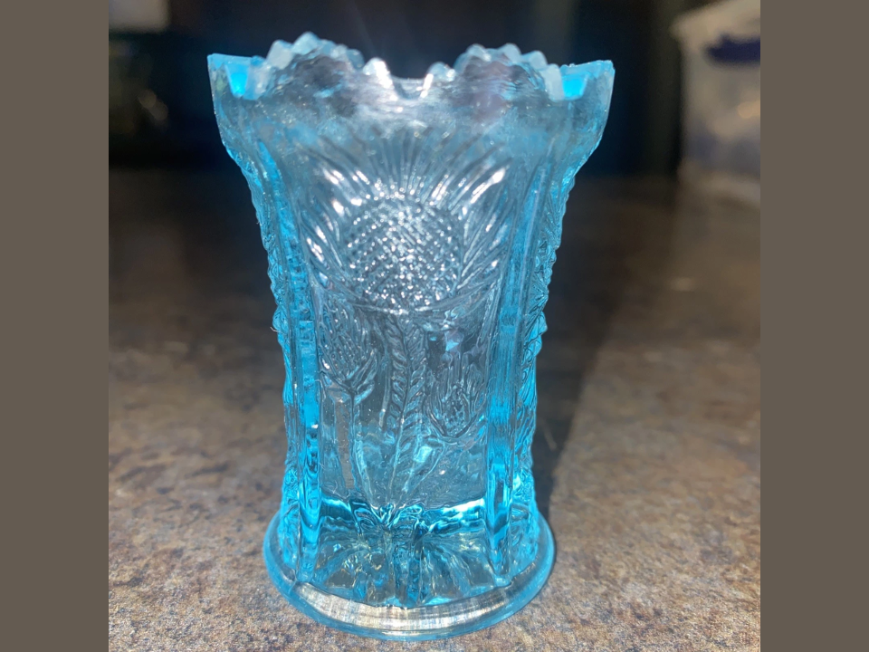 The Thistle Pattern, produced by Fenton Glass, features a beautifully detailed thistle flower, which is raised above the surface of the glass. This pattern is often found in iridescent glass, making the colors shift when viewed from different angles. Fenton produced the Thistle Pattern in several colors, including amber, green, and blue, with the most prized pieces being those in the unique opalescent glass. The pattern is most associated with the 1940s and remains a favorite among glass collectors.