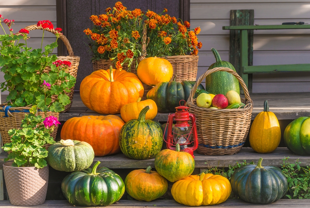 For a more natural harvest look, gourd and squash arrangements make for an easy yet beautiful display. Arrange several colorful gourds and squash in baskets or create a heap of them beside your front door. Their vibrant colors and textures give off a cozy fall vibe and are great for a harvest-inspired porch. You can even add a couple of large pumpkins to the display for extra seasonal charm.