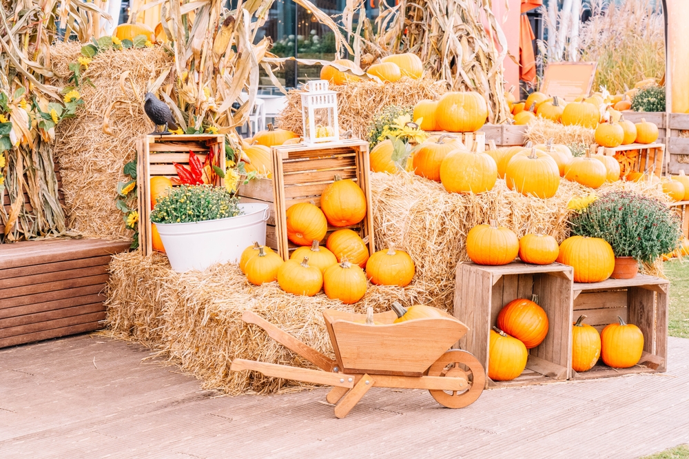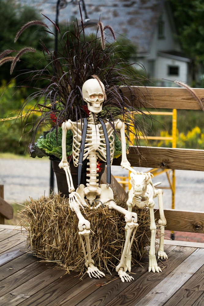 A skeleton sitting on a hay bale combines the harvest theme with spooky Halloween fun. You can use a life-sized skeleton and position it casually on a hay bale, dressed in overalls or a plaid shirt to match the autumn theme. Surround the skeleton with a few pumpkins, and you’ve created a festive yet eerie display. The skeleton will add that Halloween touch while still feeling like part of a harvest celebration.