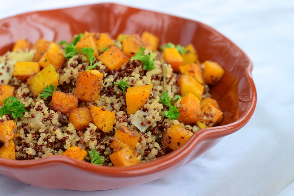 Roast diced pumpkin in olive oil until tender. Cook the quinoa according to the package instructions, then combine it with the roasted pumpkin, spinach, and nuts. Drizzle with olive oil and lemon juice, and season with salt, pepper, and fresh herbs. Serve warm or cold for a delicious and healthy salad.