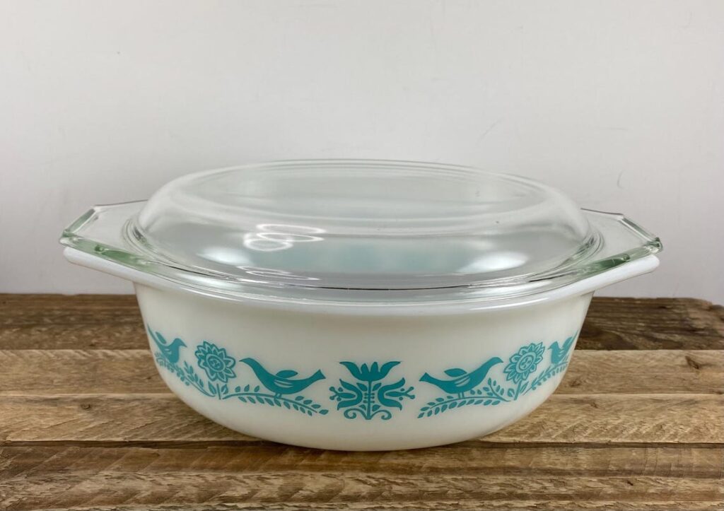 Bluebird has a gentle bird and flower look that suits spring especially well. This promotional casserole pattern ran from 1959 through 1961, and the turquoise birds on white glass give it a lighter feel than many darker kitchen patterns. Collectors tend to like it because it feels close to Butterprint while still having its own look. A covered oval casserole often sells in the $40 to $90 range.