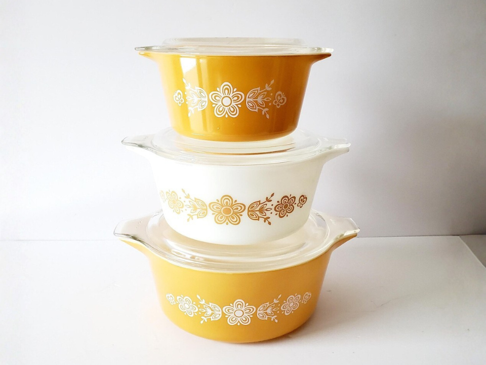 Butterfly Gold stays one of the better-known Pyrex lines from the 1970s. The pattern mixes butterflies and flowers in warm yellow and gold tones, which gives it a sunny kitchen look that many people still enjoy in spring. It is common enough to collect without too much trouble, though the cleanest full sets still sell well. A Cinderella bowl set often goes for about $130 to $220.