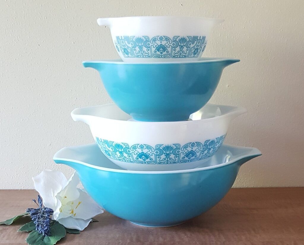 Butterprint is one of the Pyrex patterns that many spring collectors keep near the top of their wish list. The pattern ran from 1957 to 1968 and is known for its farm scene with an Amish couple, roosters, and crops, usually in turquoise and white or pink and white. It feels right for spring because the soft colors and folk art look pair well with lighter seasonal displays. A full Cinderella bowl set in good condition often lands around $250 to $400, with stronger sets moving higher.