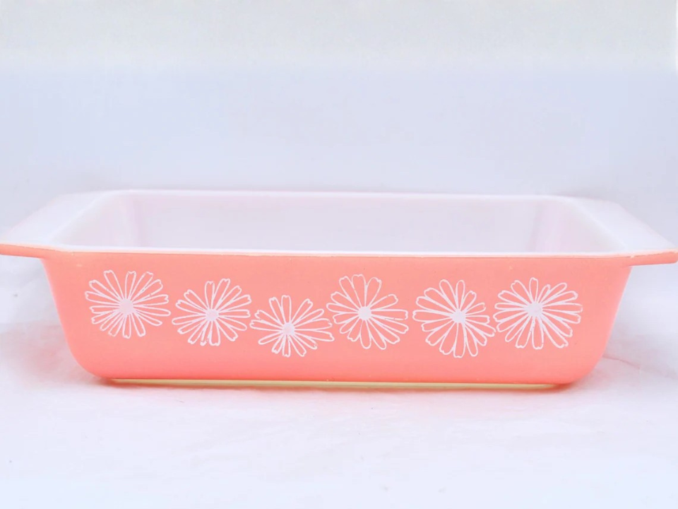 Pink Daisy is one of those patterns that instantly feels tied to warmer weather and lighter rooms. Common oval casseroles with lids often land around $45 to $75, which keeps it more reachable than the rarest pink Pyrex lines. Collectors like it for the pink floral print and the way it adds color without taking over a display. In spring, it works especially well with milk glass and pale florals.