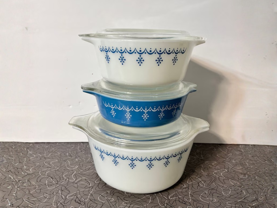 This pattern does very well with people who like soft blue Pyrex but want something less common than Snowflake. The bird motif feels right for spring shelves, especially beside pale pottery and floral linens. Since Bluebird often shows up as a casserole rather than a full, large line, nice, complete pieces get noticed fast. Clean white glass and a matching lid help a lot with value.
