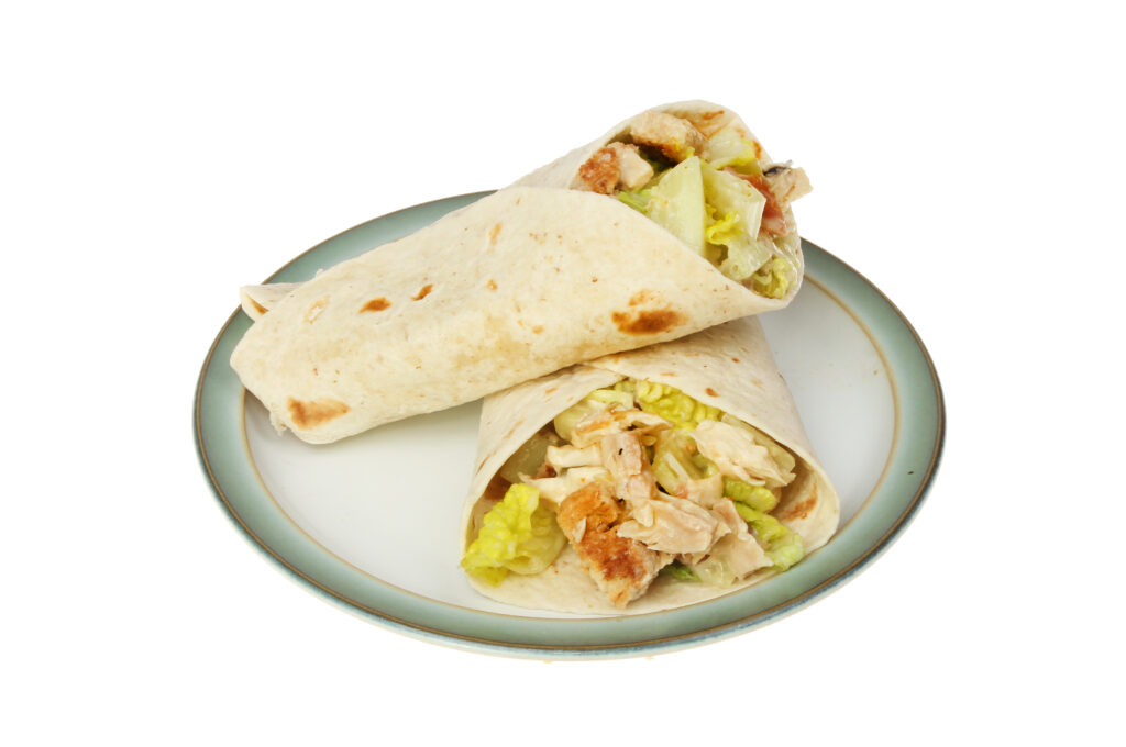 Mix the chicken with the Caesar dressing in a bowl, then fold in the romaine, Parmesan, and croutons just before serving so the lettuce stays crisp. Spoon the filling into the tortillas, fold in the sides, and roll them up tightly. Slice in half and serve right away. Total time is about 10 minutes.