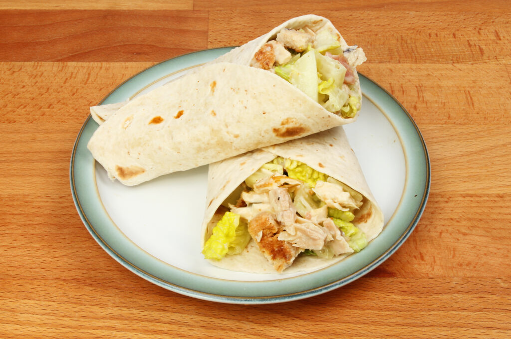 You will need 4 large tortillas, 2 cups chopped rotisserie chicken, 3 cups chopped romaine, 1/3 cup Caesar dressing, 1/4 cup grated Parmesan, 1/2 cup croutons crushed, and black pepper to taste.