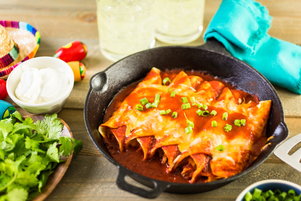 This skillet dinner has the same flavors as enchiladas without the rolling and baking. Tortilla strips soak up the sauce and turn soft while still keeping some bite. It is a quick one pan meal that feels hearty.