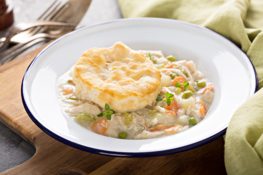 Prep time is 15 minutes and bake time is 18 to 22 minutes at 400°F (200°C), cook butter and flour, whisk in broth and milk to thicken, stir in chicken and vegetables, then top with biscuits and bake until browned.