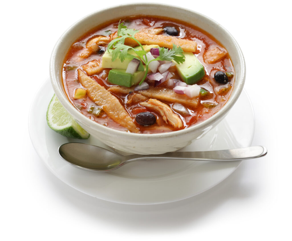 Prep time is 10 minutes and cook time is 20 minutes, simmer everything except toppings in a pot on medium heat, then finish with chicken for the last 5 minutes and serve with lime and crunchy strips.