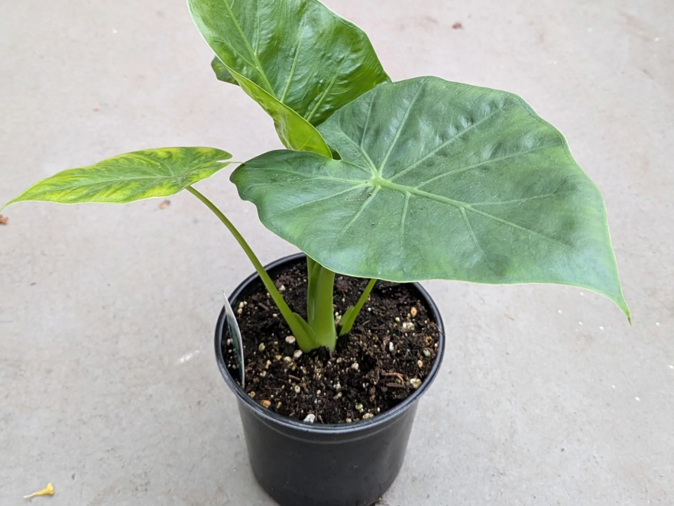 The Alocasia ‘Regal Shield’ is a majestic variety, known for its large, glossy leaves that appear almost metallic in certain lighting. Its dark green, nearly black leaves are broad and robust, which gives it a truly regal appearance. This variety is one of the larger Alocasias, capable of reaching up to 3 feet in height, making it an excellent choice for creating a bold statement in any room or garden.