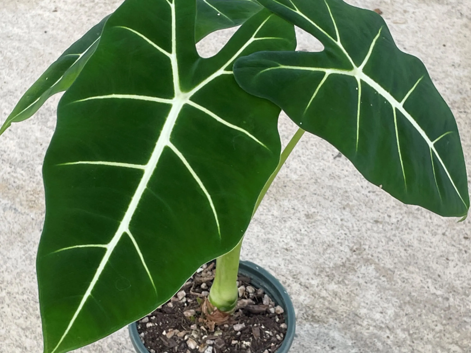 The Alocasia ‘Polly,’ often referred to as the African Mask Plant, is a striking variety that commands attention with its arrow-shaped leaves and deep green color. The leaves are accentuated by bold, white veins that create a dramatic contrast, making it a favorite among indoor plant enthusiasts. Its compact size makes it perfect for smaller spaces, but its bold, intricate leaves can easily become a focal point in any room. The ‘Polly’ prefers bright, indirect light and thrives in humidity, which is essential for maintaining its lush, glossy foliage.