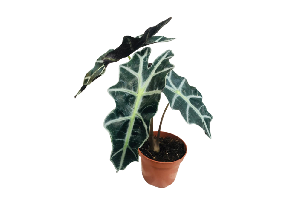 The Alocasia ‘Bambino’ is a dwarf variety that still maintains the big, bold personality of its larger relatives. With its compact size, this plant is perfect for smaller spaces or for those who want to add a touch of tropical drama without the commitment of a large plant. The ‘Bambino’ has striking, arrow-shaped leaves that are glossy and deep green with pronounced white veins. While small, this plant packs a punch in terms of visual impact, making it ideal for tabletops or as part of a collection.