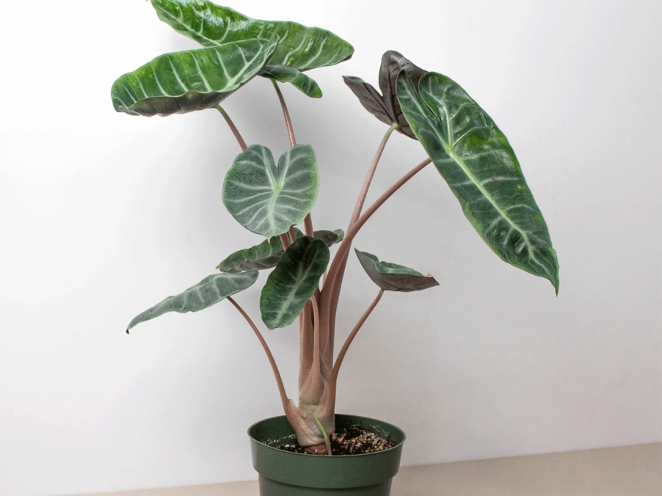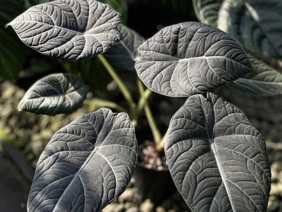 The Alocasia ‘Black Velvet’ is a compact and rare variety known for its dark, velvety leaves. The leaves are almost black, with deep, rich green undertones and striking white veins that stand out like intricate lacework. It’s one of the most unique Alocasias, offering a dark and mysterious appearance that adds an air of sophistication to any indoor space. The ‘Black Velvet’ thrives in bright, indirect light and prefers a warm, humid environment to retain its lush foliage.