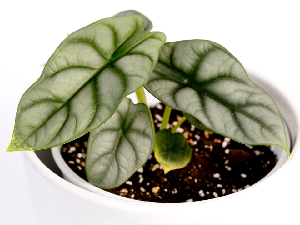 It prefers bright, indirect light and should be kept in a warm, humid environment to maintain its dramatic leaf shape. Watering should be moderate, ensuring the soil is moist but never soggy. Like many Alocasias, the ‘Silver Dragon’ needs a well-draining potting mix to avoid root rot. Its compact size makes it ideal for display in smaller spaces or as part of a collection of tropical plants. With its unique, silvery appearance, it’s a plant that adds personality and intrigue to any collection.