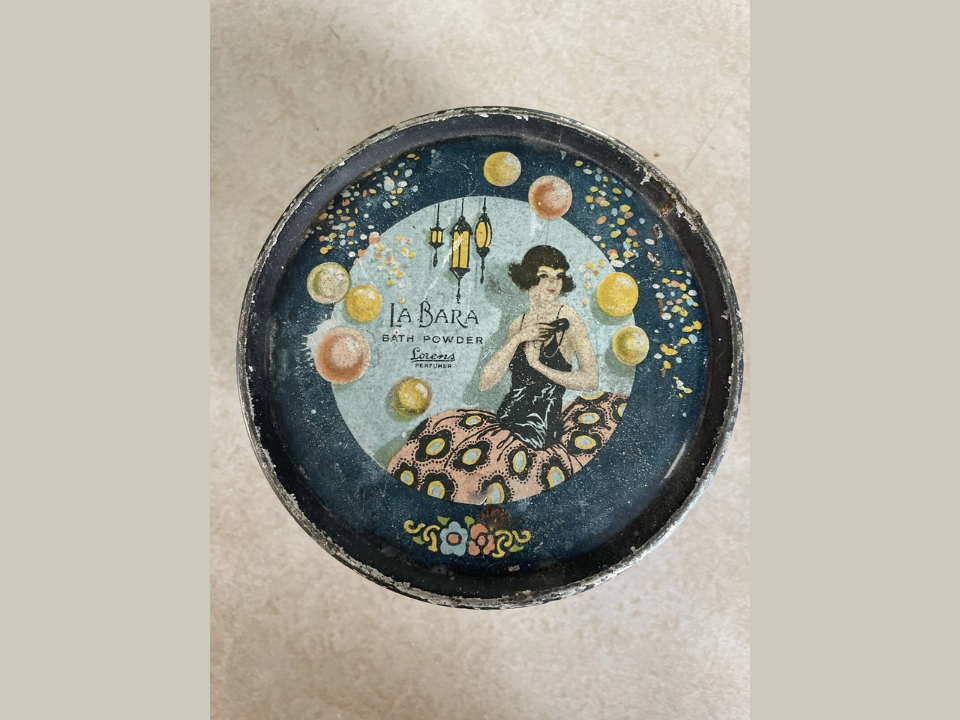This luxurious powder tin from the 1920s features an elegant Art Deco design, with the glamorous portrait of silent film star Loren Bara. The detailed portrait and refined typography on the tin make it a sought-after collectible.