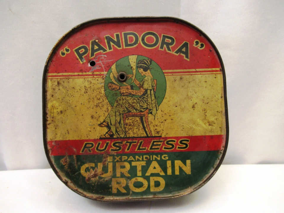This advertising tin, promoting Pandora curtain rods, showcases an elegant Art Deco design with stylized patterns and a metallic finish. The tin’s compact size and distinctive appearance make it a standout piece.