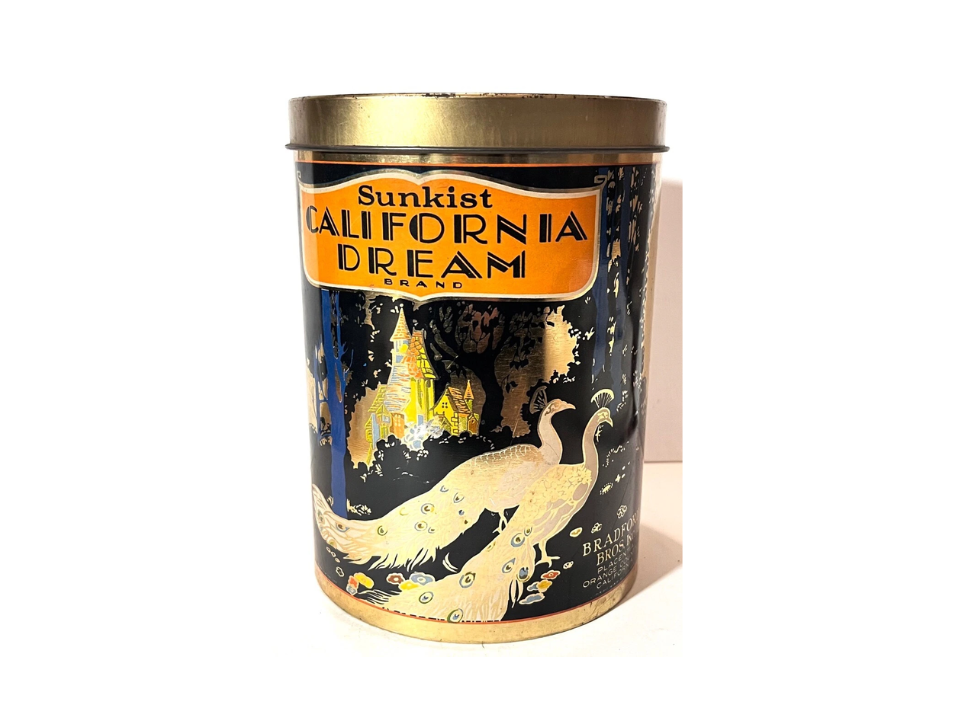 This tin, used for packaging Sunkist citrus products, features a vibrant design with peacock motifs and a castle backdrop. The combination of bright colors and detailed illustrations exemplifies the Art Deco aesthetic.