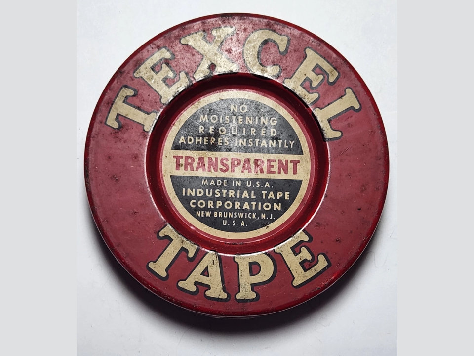 This vintage tin, used for packaging Texcel tape, features a minimalist design with bold typography and a two-tone color scheme. The simplicity and clarity of the design are characteristic of the Art Deco style.