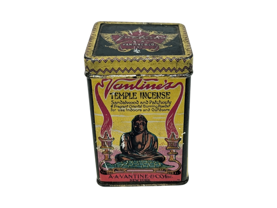 This tin, promoting Vantine’s incense products, features an exotic design with Eastern-inspired motifs and a rich color palette. The intricate patterns and vibrant hues are emblematic of the Art Deco movement’s fascination with global influences.