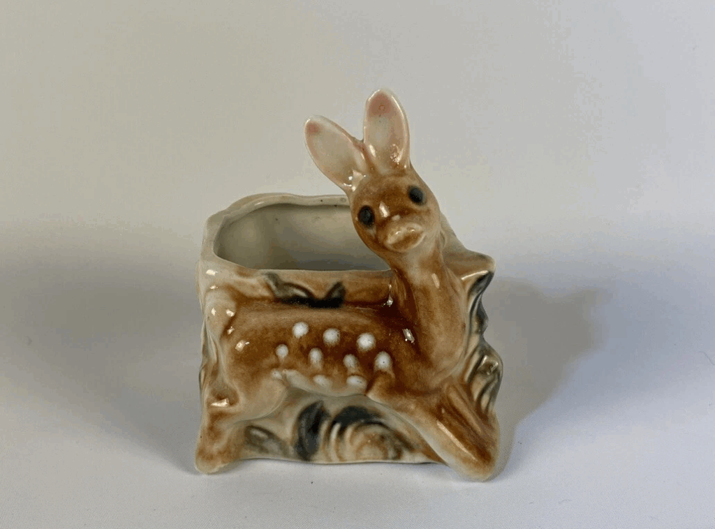 The deer planter’s delicate features and soft colors make it a standout piece in any vintage collection. Its compact size allows it to be placed on mantels, bookshelves, or as part of a nature-themed display. This piece reflects the mid-century love for whimsical animal figures, a theme that remains popular among collectors. Its simple yet elegant design captures the essence of post-war optimism. For those interested in vintage animal planters, this deer is a must-have item that adds charm to any space.