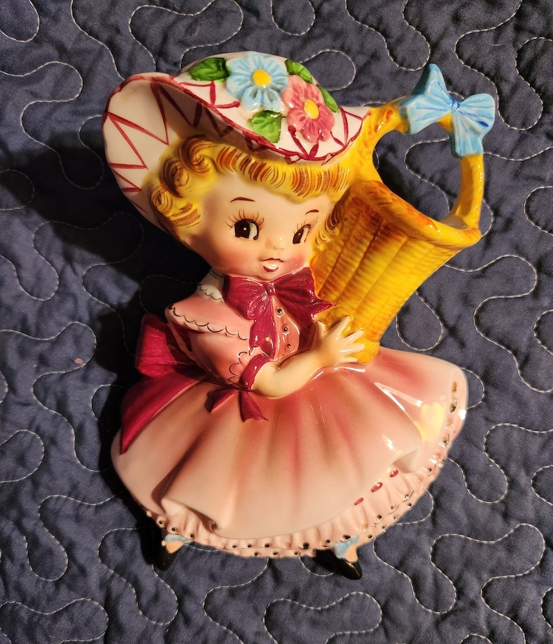 Lefton’s Miss Daisy planter, produced in the 1950s, features a charming depiction of a young girl in a dress, holding a basket of flowers. Made in Japan, it reflects the post-war collaboration between American companies and Japanese manufacturers. At its release, it was an affordable decorative piece, appealing to those looking to add a touch of whimsy to their home dcor. Currently, it is valued between $50 and $80, depending on condition and market demand. Collectors often seek it out for its nostalgic representation of mid-century femininity and charm.