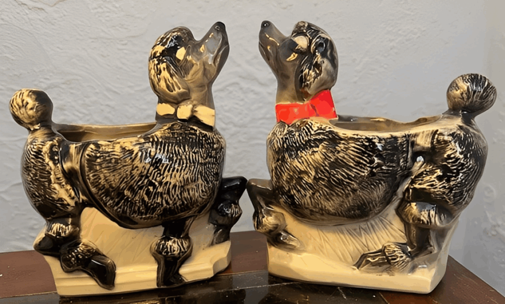 McCoy’s Pottery Poodle Planter from the 1950s is a delightful and playful design that showcases the company’s dedication to whimsical animal-themed decor. The planter features a cute poodle with a fluffy tail, embodying the charm and elegance of mid-century design. At the time of its release, it was an affordable decorative piece, widely popular in the 1950s. Today, it is valued between $50 and $80, depending on condition and glaze. Its enduring appeal lies in the combination of McCoy’s high-quality craftsmanship and the adorable poodle design.