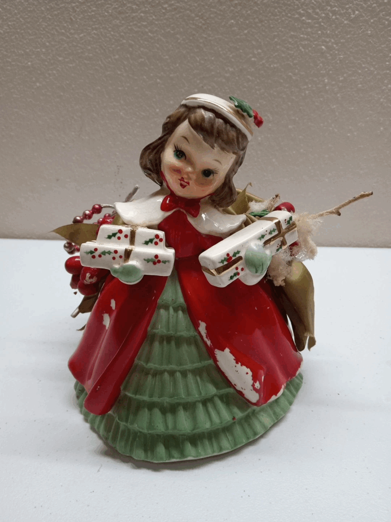 Produced by Napco in the 1950s, this planter features a cheerful girl holding shopping bags, embodying the festive spirit of the era. Made in Japan, it reflects the post-war collaboration between American companies and Japanese manufacturers. At its release, it was an affordable decorative piece, appealing to those looking to add a touch of whimsy to their holiday dcor. Currently, it is valued between $20 and $40, depending on condition and market demand. Collectors often seek it out for its nostalgic representation of mid-century holiday celebrations.
