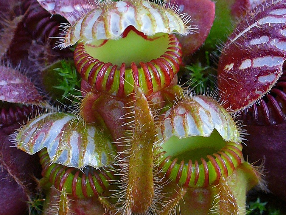 The plants rely on their bright colors and nectar to lure prey into their traps. Heliamphora thrives in nutrient-poor soils, supplementing its diet with captured insects. These plants are often found in high-altitude environments where the air is thin and the soil is acidic, making them well-adapted to harsh conditions.