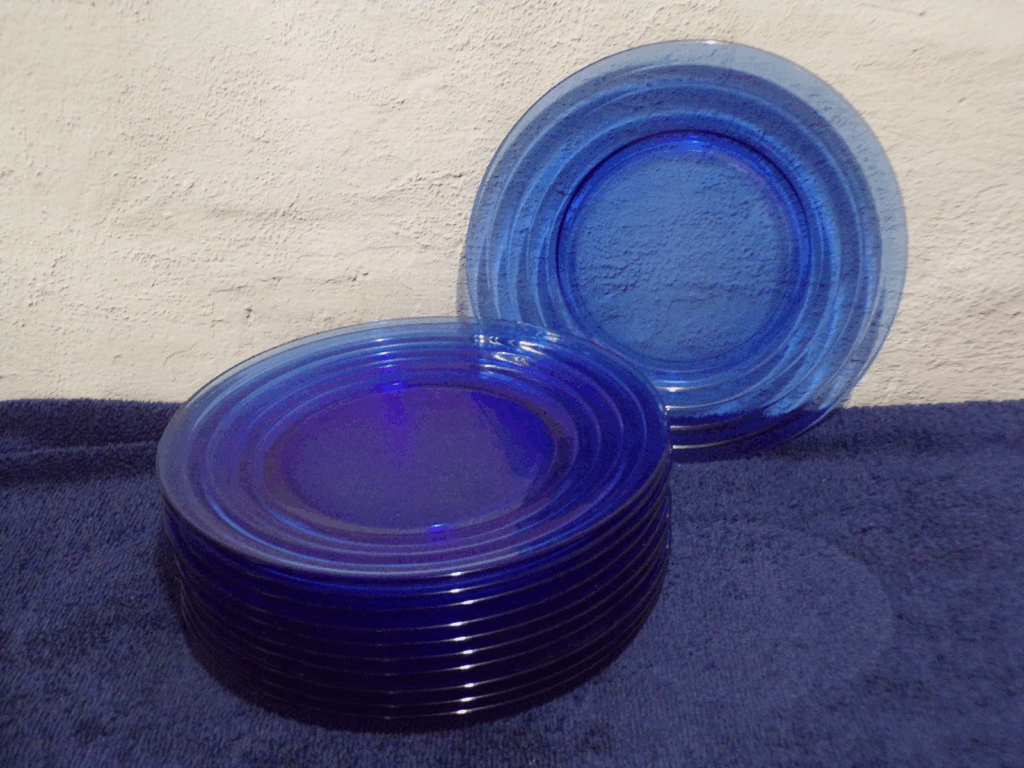 Cobalt blue Depression glass salad plates were introduced in the 1930s and became an elegant addition to the dinner table. Their smooth, bright finish and delicate designs made them perfect for both everyday use and formal occasions. These plates were made in various patterns, including geometric and floral motifs, allowing for a variety of choices depending on personal preference. Today, these plates can sell for $50 to $100, depending on the pattern and condition.