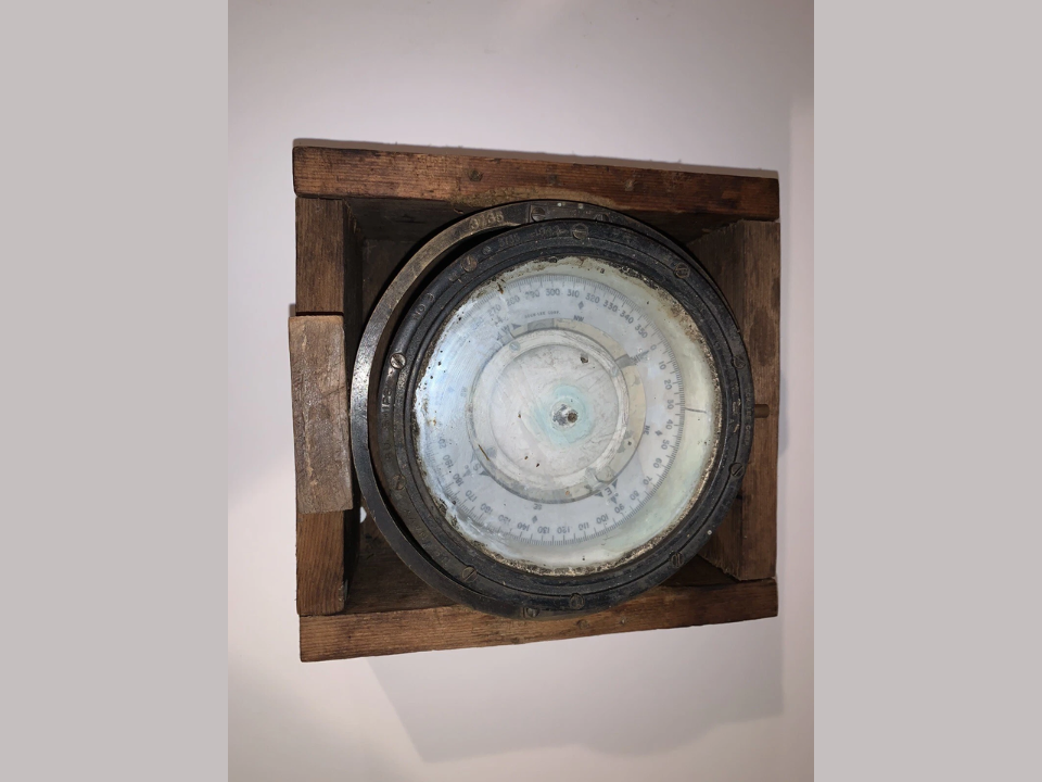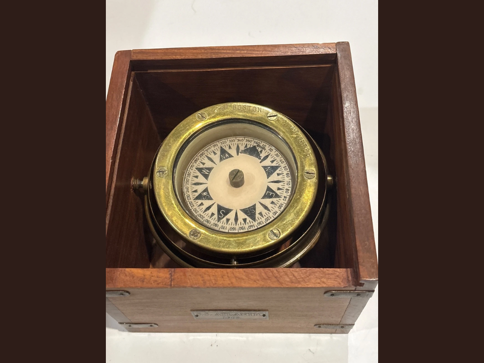 The Star Boston ship’s compass, dating back to the early 20th century, is housed in a wooden box and features a brass compass with a clear glass face. The compass is marked with the S.S. Maritime Atlantic 1905, indicating its use during that period.
