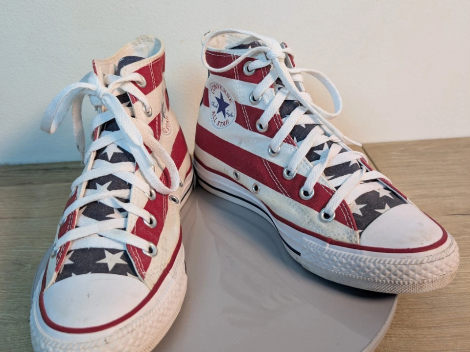 The Converse Chuck Taylor ‘American flag’ edition brings a bold and patriotic twist to the iconic sneaker. Featuring a black and white design of stars and stripes, it offers a stark, modern take on the American flag. The strong contrast between the black and white colors adds a contemporary edge while still maintaining the classic Chuck Taylor silhouette. Its graphic nature and symbolic design appeal to those with a sense of style and national pride.