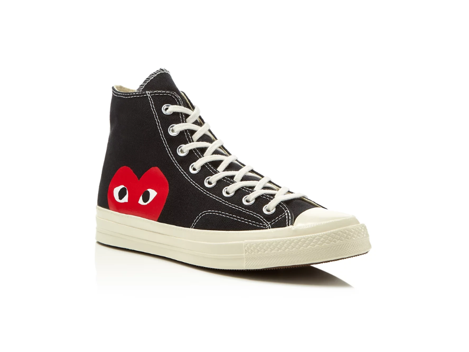 The Converse x Comme des Garçons Play Chuck Taylor is a collaboration that merges the simplicity of Converse with the high-end sophistication of Comme des Garçons. This sneaker features the classic Chuck Taylor silhouette but with a twist—a small red heart logo, designed by Comme des Garçons, prominently placed on the side. This simple yet impactful design gives the shoe a minimalist, high-fashion appeal. The use of premium canvas and leather elevates the overall aesthetic, while the heart logo has become synonymous with the brand’s streetwear status.