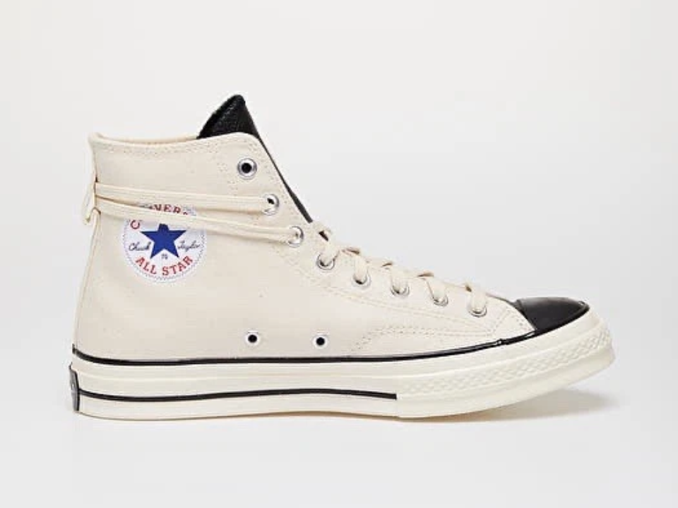 The Converse Chuck Taylor All-Star ’70s Off-White Edition is a collaboration with the iconic streetwear brand Off-White, known for its fashion-forward designs. This sneaker features a neutral off-white canvas upper, which is complemented by leather overlays that provide durability. The signature orange tag, typically seen on Off-White collaborations, hangs from the laces, while the zip tie adds an extra layer of street style. Its vintage ’70s aesthetic is enhanced with a slightly elevated sole and premium craftsmanship, creating a timeless and contemporary design that appeals to both sneakerheads and fashion lovers alike.