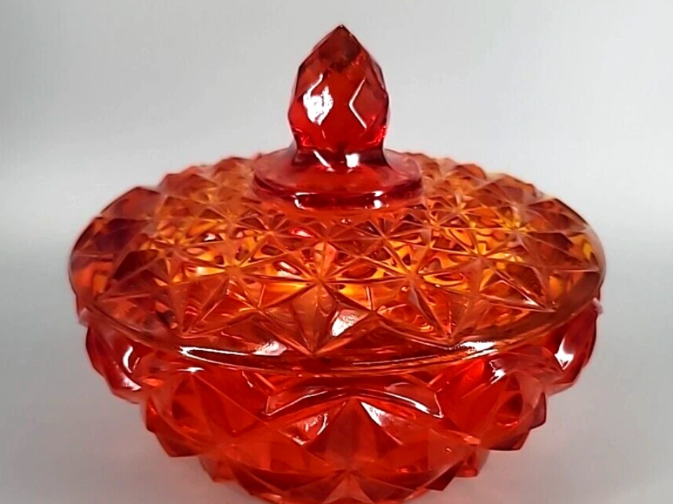 Amberina is a unique type of glass that starts as amber and transitions into a red or orange hue when held up to light. This stunning color was produced primarily by the Indiana Glass Company and featured patterns like “Candlewick” and “Diamond Point.”