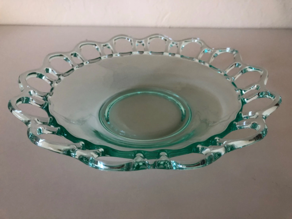Turquoise Depression glass is one of the more sought-after colors, featuring a vibrant blue-green hue. Produced during the late 1930s and early 1940s, it was often seen in patterns like “Lace Edge” and “Herringbone.” This color was beloved for its bright, refreshing appearance.
