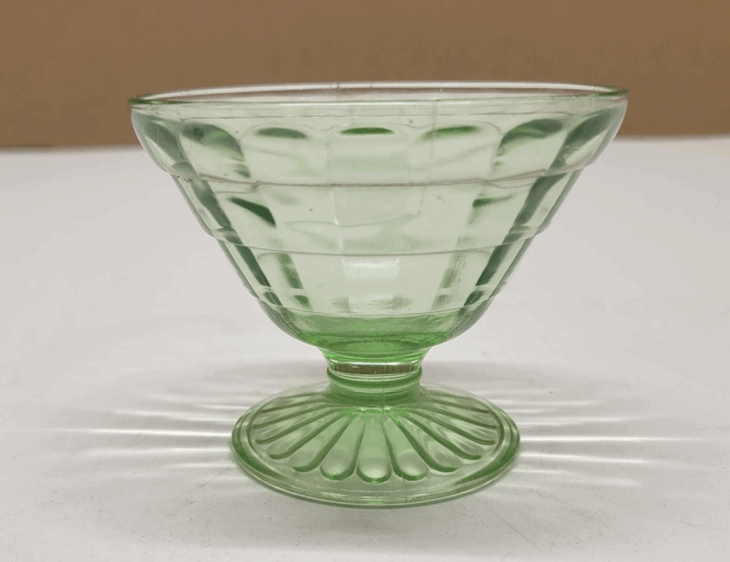 Released from 1929 to 1933, the Block Optic pattern displays a distinct grid texture that catches and reflects light. The design gives each piece a three-dimensional look, especially in green glass. Because of its clean lines and visual depth, it has become one of the most collected Depression Glass patterns. The short production span makes authentic sets rare. Values today range from $80 to $250, depending on condition.