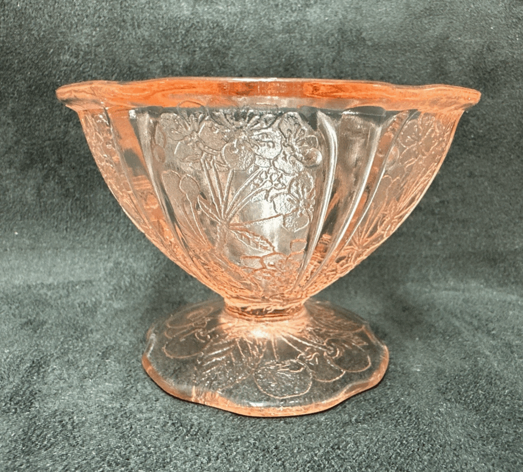 Introduced in 1929, the Dogwood pattern features graceful raised flowers and elegant curves. It was available mainly in pink and crystal variations, both highly collectible today. These items were thin and fragile, which adds to their rarity. The pattern’s name and floral design give it timeless charm among vintage glass fans. Depending on rarity, prices range from $120 to $400.