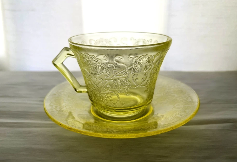 Produced from 1932 to 1935, the Florentine Poppy pattern features delicate raised flowers and scrollwork. The bright yellow color adds warmth and cheer to dining tables, which was uplifting during difficult times. These pieces were often used as promotional giveaways, which helped them spread widely across households. Today, perfect-condition pieces are scarce due to their fragility. Prices typically range from $120 to $400.