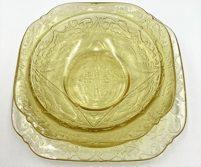 Collectors are drawn to its decorative designs and classic golden hue. Larger serving pieces and complete dinner sets are especially valuable. Authentic pieces show clean, pressed glass lines and a consistent color tone. It has become a collector favorite for its balance of history and beauty. Madrid remains one of the finest examples of Depression Glass artistry.