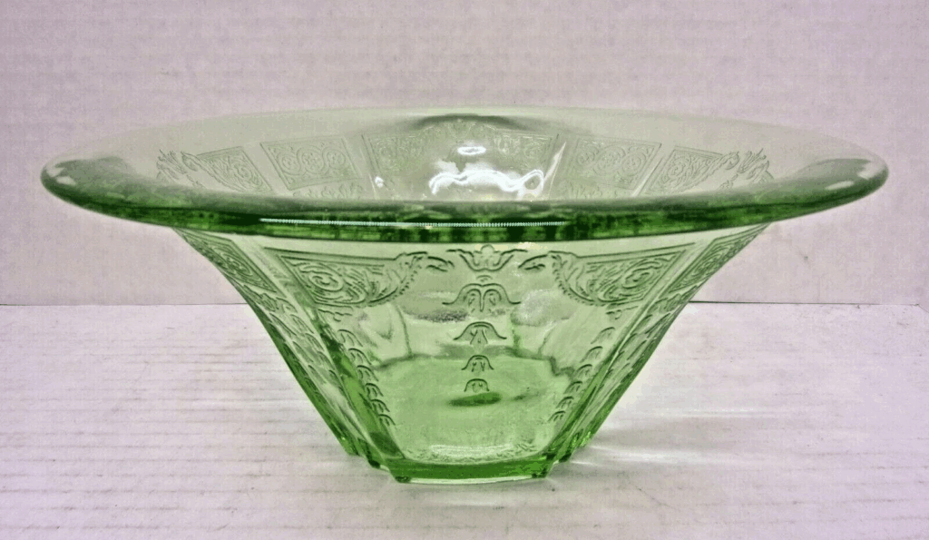 Introduced in 1931, the Princess pattern features geometric shapes and a strong Art Deco influence. Produced by Hocking Glass, it came in several colors, though the green version is the most collectible. Many of these pieces were distributed through promotions and grocery giveaways, which made them widely available at the time. However, surviving complete sets have become scarce due to fragility. Today, individual pieces can sell between $100 and $250.