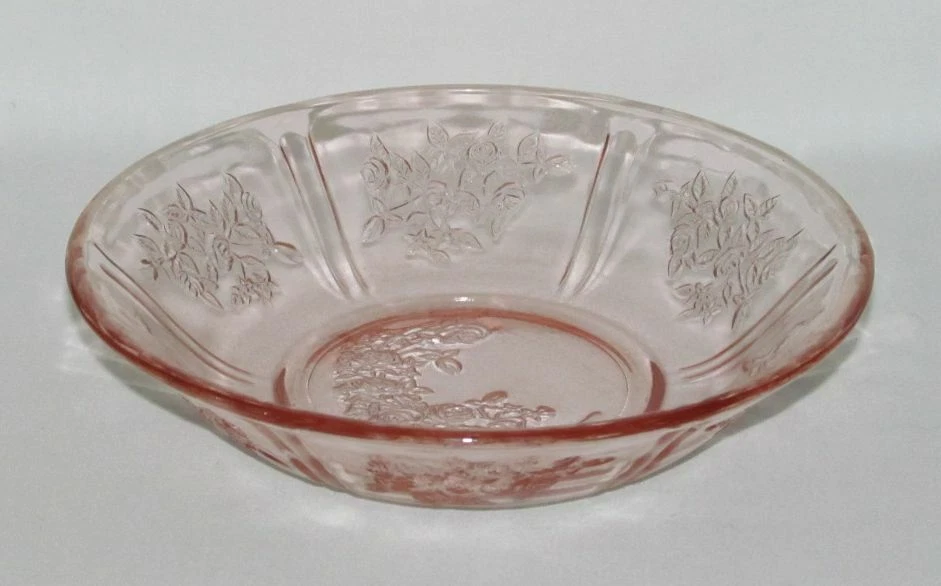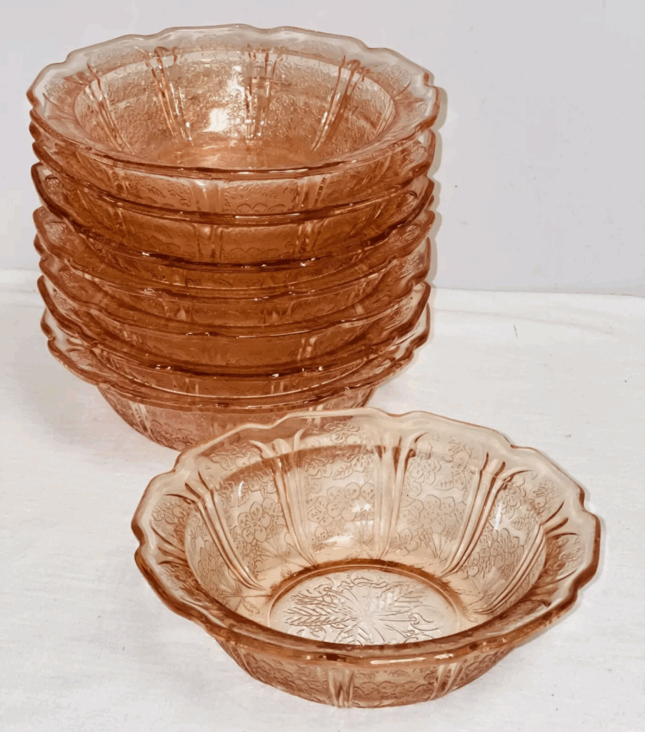 Federal Glass produced the Cabbage Rose pattern during the 193’s and included pieces like cereal bowls in promotional cereal box campaigns. These bowls featured beautifully detailed floral motifs, with roses delicately etched into the glass. The rarity of these pieces is due to their limited release and the fact that many were broken or discarded over time. Today, a Cabbage Rose bowl can be worth anywhere from $50 to $120, depending on its condition and color.
