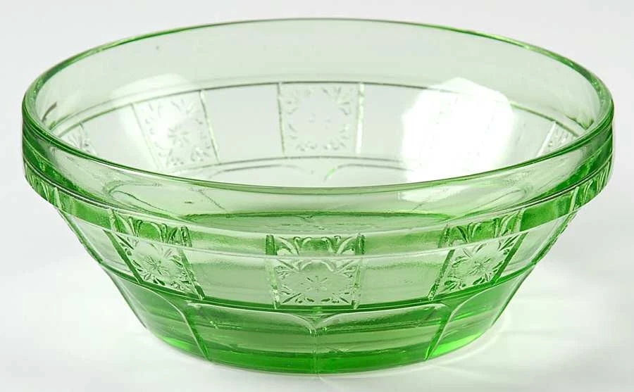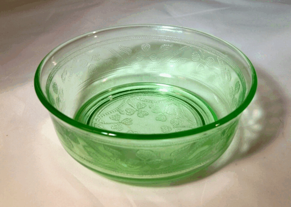 Hazel Atlas’s Cloverleaf pattern was introduced in the 193’s and became a popular premium in cereal boxes. The glass bowls feature a charming design with clover-shaped motifs, which were both stylish and practical during the Depression era. These bowls were not produced in high quantities, and their fragility makes them a rare find today. Prices for a well-preserved Cloverleaf bowl typically range from $50 to $80 depending on the condition.