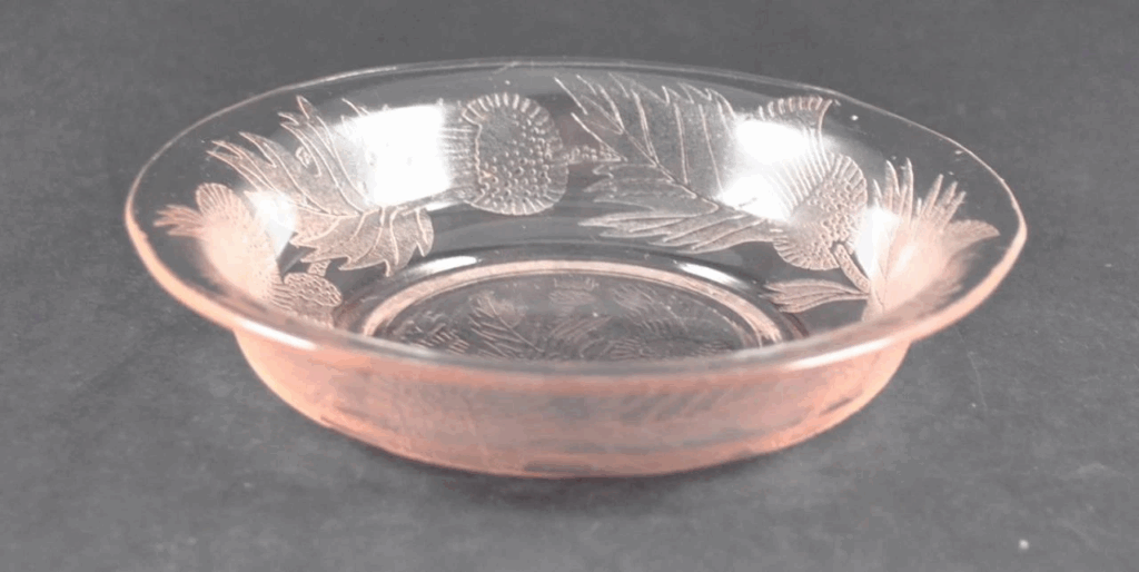 Macbeth-Evans released the Thistle pattern in the 1930s, and these delicate glass cereal bowls were included in cereal boxes as a promotional item. The Thistle pattern featured floral engravings, which gave the glassware a unique, vintage charm. These bowls were marketed as an affordable luxury for families during the Great Depression. The bowls became rare over time because of their fragile nature and limited distribution. Today, a well-maintained Thistle bowl can sell for over $6′ depending on its condition.