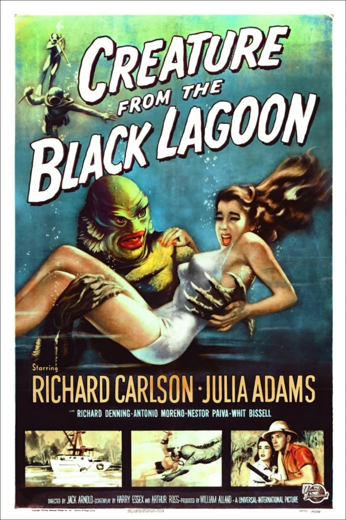 The Creature from the Black Lagoon poster embodies 1950s monster movie excitement. With vivid underwater scenes and the Creature’s menacing figure, it promised thrills that delivered on-screen. The design captured both horror and adventure, which helped draw massive audiences.
