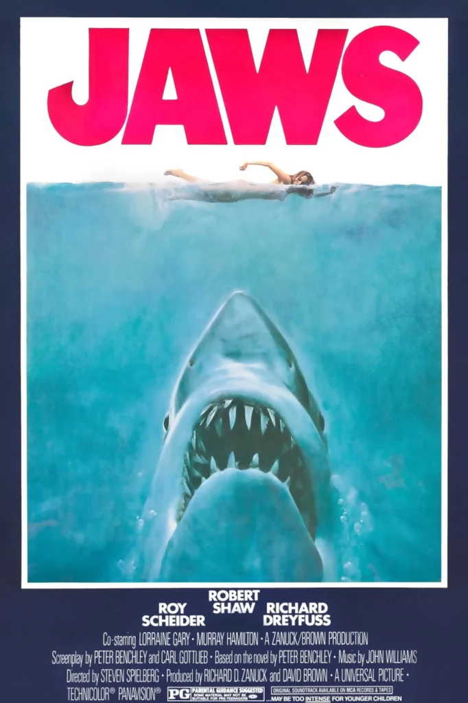 The Jaws poster is one of the most famous ever created. The image of the giant shark rising toward the unaware swimmer became a symbol of primal fear. Its blue gradient background and bold typography have been copied by countless artists since its release.